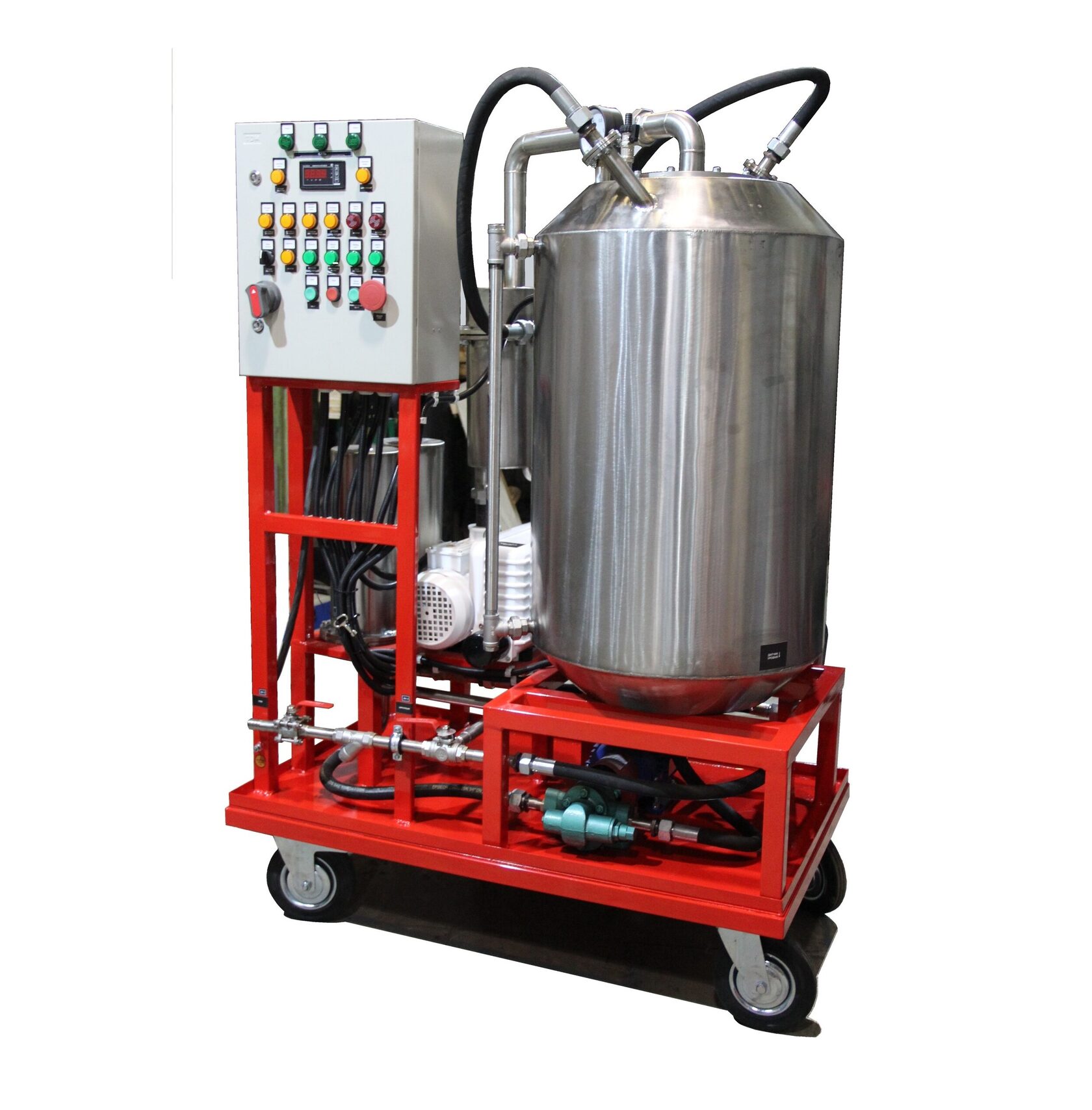 Вакуум-дегазационная колонна ВДК. Внутри колонны находится сверхзвуковой жидкостно-газовый эжектор для распыления масла и улучшения процесса дегазации и отделения влаги, а так же датчики уровня масла. Имеется смотровая стеклянная трубка в защитном металлическом кожухе для визуального контроля процесса заполнения уровня масла и пенообразования в колонне. В верхней части колонны расположен мановакууметр и кран регулирующий вакуум в колоне, так же используется для гашения пены в колонне. Вакуумная часть установки предназначена для создания вакуума в колонне, оснащена вакуумной ловушкой для улавливания водяных паров, капельного масла и пены, для предотвращения попадания его в масло вакуумного насоса. Вакуумная часть установки состоит из: Вакуумный насос оснащен высокоэффективным масляным фильтром, который решает проблему масляного тумана и продлевает срок службы насоса. Агрегат вакуумный оснащён газобалластным клапаном, который можно устанавливать в 2 положениях, тем самым варьируя конечное давление. Гидравлическая часть установки предназначена для подачи масла в колонну, его нагрева, фильтрации и откачки из колонны обработанного масла потребителю через выходной штуцер. Гидравлическая часть установки состоит из: входного штуцер, фильтра грубой очистки, закачивающего масляного насоса, и откачивающего насоса масло нагревательных колонн, температурных датчиков, а так же реле потока, вакуум-дегазационной колонны, фильтров тонкой очистки, выходного штуцера и кранов, управляющих потоками масла. Схема соединения трубопроводов и запорной арматуры позволяют управлять потоками масла и обеспечивать несколько режимов работы установки. Фильтрующие элементы фильтров тонкой очистки обеспечивают тонкость фильтрации и чистоту масла в пределах, установленных параметрами установки. Нагреватель масла разделен на 3 группы. Каждая секция управляется отдельно со шкафа управления, что позволяет подобрать оптимальный тепловой режим и исключить частые срабатывания коммутирующей аппаратуры. Электрооборудование служит для управления привода насосов, электронагревателями масла и обеспечивает заданный технологический процесс. В состав электрооборудования входят:
